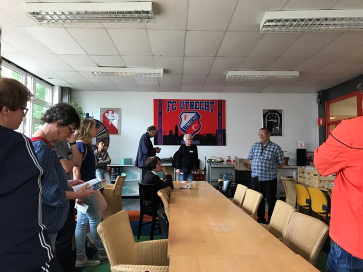 Op 9 juni bezochten zorgverleners, buurtteammedewerkers en sociaal makelaars zes plekken in Ondiep waar mensen vaak vrijwillig werk doen voor de buurtbewoners. Op de foto: Evert Renswouw (in geruit overhemd), vrijwilliger bij de Voedselbank in Ondiep geeft uitleg. Dat waren de volgende plekken: